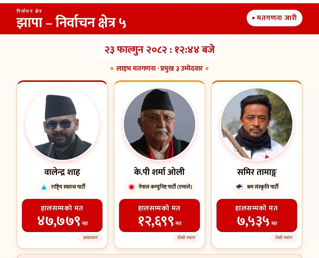 झापा–५ मा मतगणना जारी रहेकाले अन्तिम परिणाम आउन बाँकी रहेको निर्वाचन अधिकृतको कार्यालयले जनाएको छ।